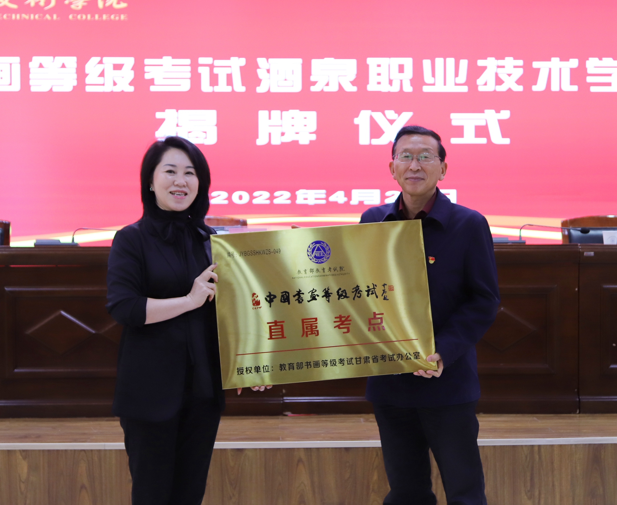 为深入贯彻全国职业教育大会精神,全面落实习近平总书记关于职业教育的重要指示批示精神,坚持正确办学方向,落实立德树人根本任务,深化职业教育改革,加快构建现代职业教育体系,弘扬中华美育精神,传承中华优秀传统文化,提高人才培养质量。4月29日上午10:00,教育部书画等级考试直属考点揭牌仪式在图书馆会议室举行。共青团酒泉市委书记阿力腾花,教育部书画等级考试甘肃省河西考区考试办公室主任李维维、执行主任尹葆芹,学校党委书记、校长易志军出席并参加仪式,仪式由学校党委副书记许军主持。