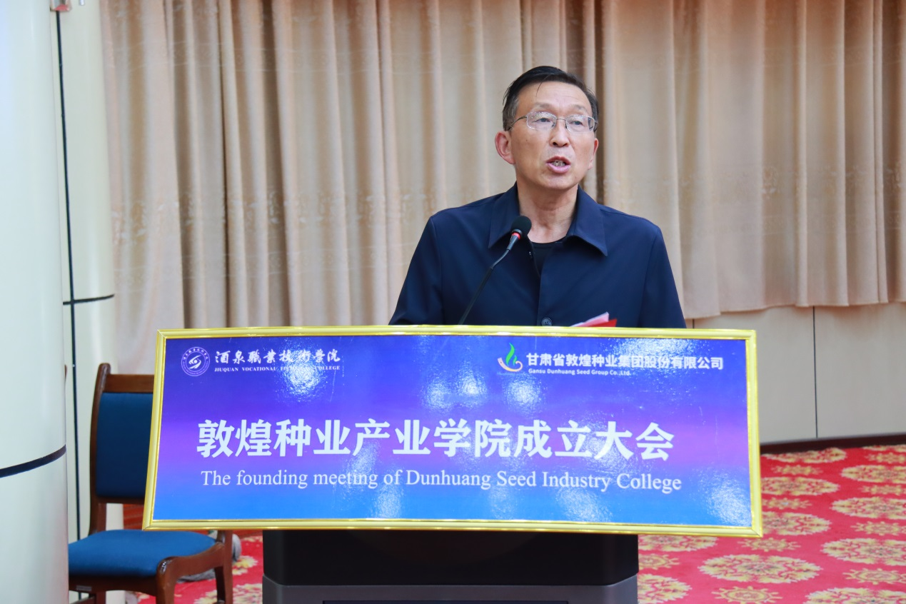 易志军在成立大会上发表了热情洋溢的致辞。他指出敦煌种业产业学院的成立,既是深化职业教育内涵建设,促进教育与产业契合发展的重要探索,也是提升职业教育服务产业发展能力的最佳体现。他希望产业学院要发挥企业在高素质技术技能人才培养中的主体作用,校企协同全力推动企业资源在人才培养中的深度融合,全面探索建立人才培养“共育、共建、共管”的产教融合、协同育人新机制。