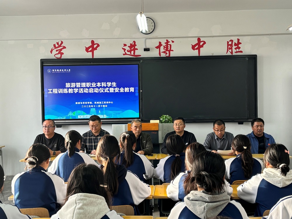 为引导学生将创新思维与工科实践相结合,在实践中学会从问题解决、流程规划、细节把控等工科视角思考问题,培养逻辑思维、空间想象能力和动手实践能力,促进了文理学科的交融与碰撞,旅游与烹饪学院与机械加工实训中心联合开展旅游管理职业本科学生工程训练教学,11月14日下午在行知楼622教室举行了旅游管理职业本科学生工程训练教学活动启动仪式暨安全教育活动。出席活动的有机械加工实训中心主任马维国、副主任李亮,旅游与烹饪学院党支部副书记、院长刘兴龙,旅游与烹饪学院教师代表以及旅游管理职业本科全体同学。启动仪式由旅游与烹饪学院副院长马东邦主持。