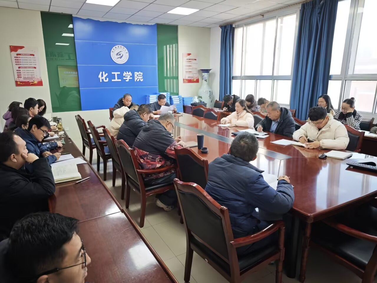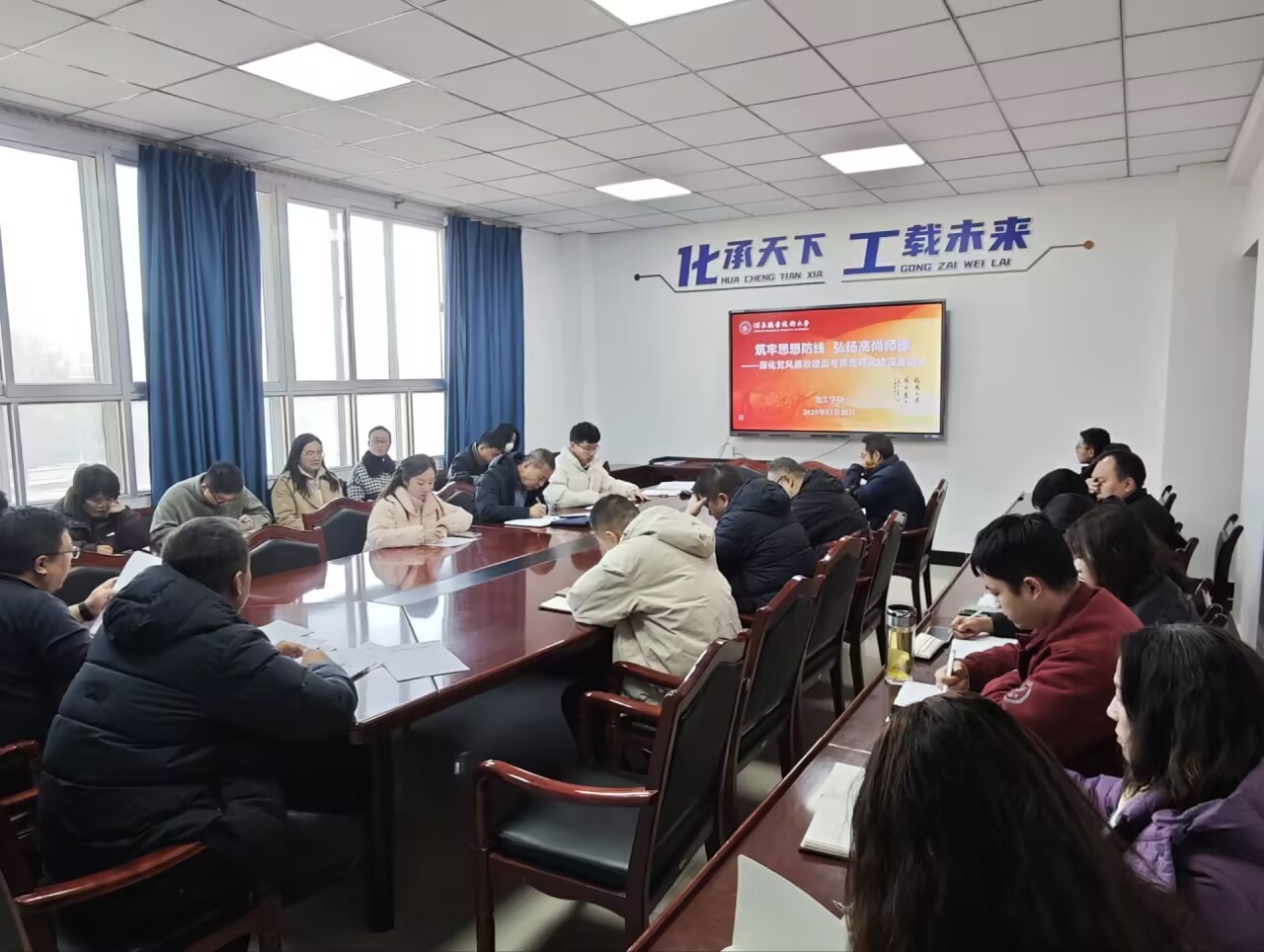 2025年11月20日上午9:00,化工学院在学院会议室召开教师座谈会,围绕“筑牢思想防线 弘扬高尚师德——深化党风廉政建设与师德师风建设”主题开展专题学习与交流研讨。学院领导班子及全体无课教师参会,党支部书记白锦川主持会议。