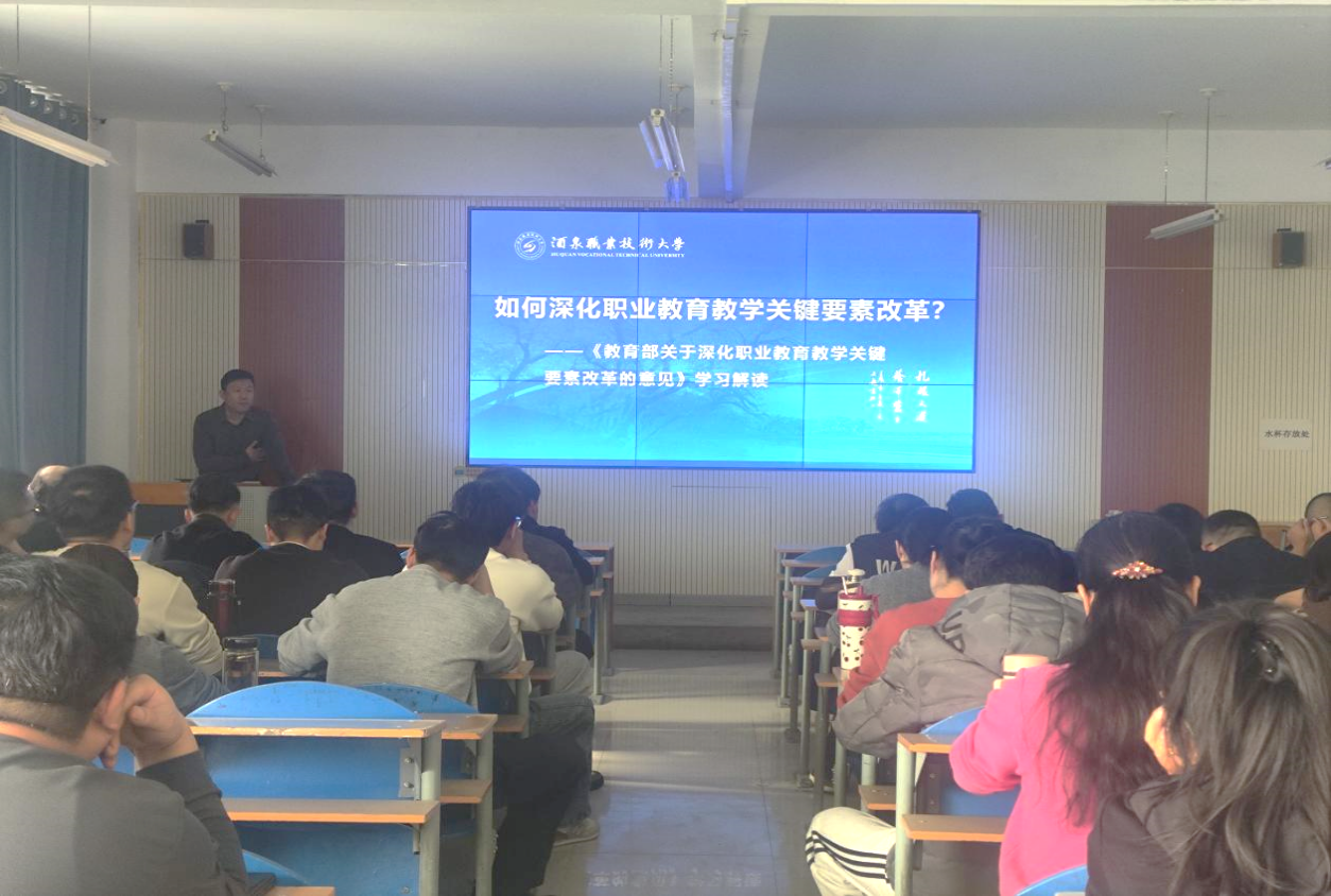 当日下午,学院聚焦教育教学关键要素改革组织专题学习,由副院长张海涛主讲。他深度解读了《教育部关于深化职业教育教学关键要素改革的意见》,围绕专业、课程、教材、教师、实习实训等核心要素展开剖析,并结合第二期高水平高职学校专业建设案例,探讨了专业优化与产业对接的有效路径。学习使教师们进一步凝聚了“以改促教”的共识,明确了对接行业需求、提升人才培养质量的方向。