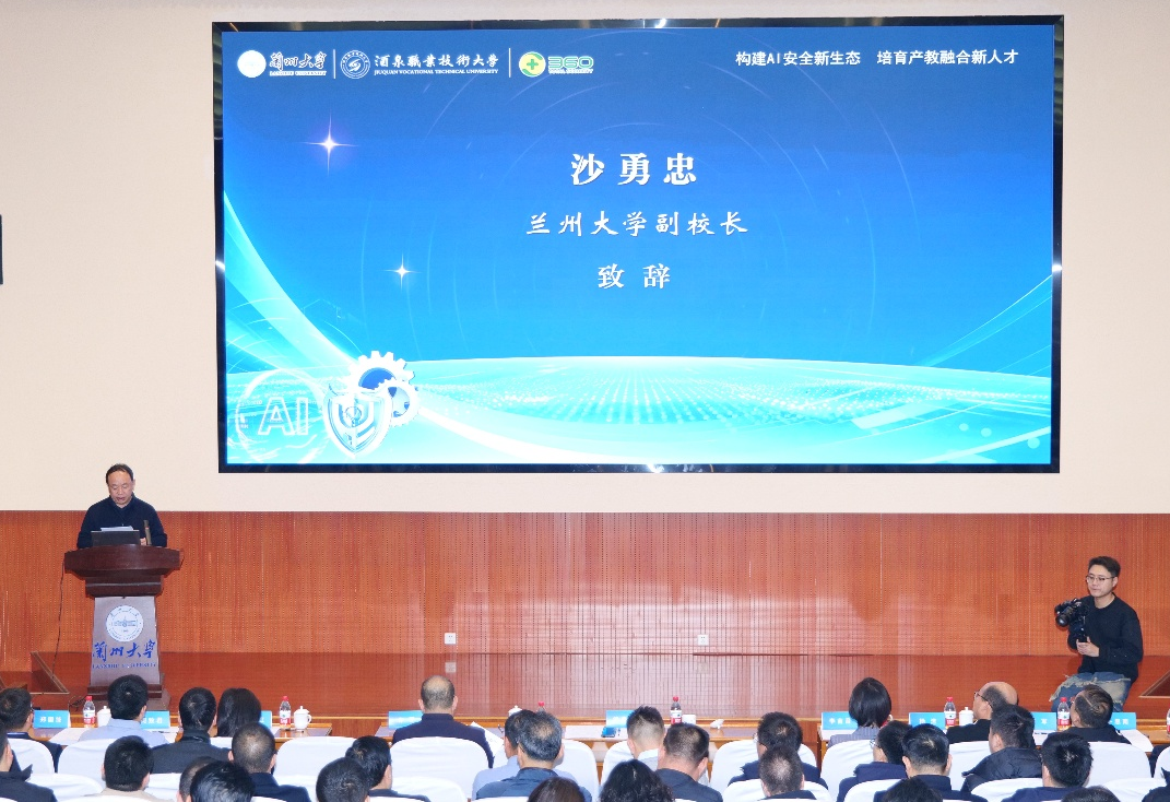 兰州大学副校长沙勇忠在欢迎辞中介绍了学校在人工智能与数字安全领域的学科布局与科研积累,表达了对产教融合共同体建设的殷切期盼。